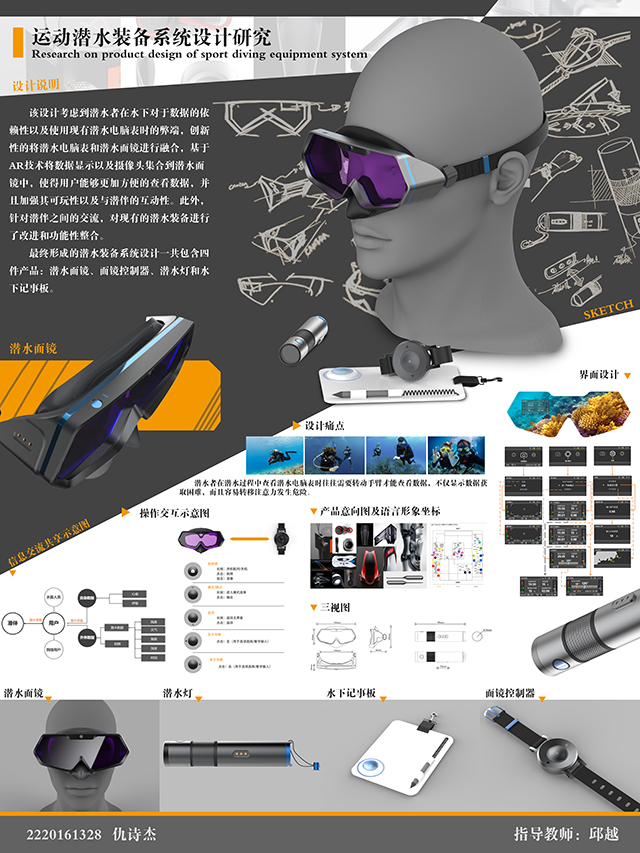 設計說明:該設計考慮到潛水者在水下對于數據的依賴性以及使用現有潛水電腦表時的弊端,創新性的將潛水電腦表和潛水面鏡進行融合,基于AR技術將數據顯示以及攝像頭集合到潛水面鏡中,使得用戶能夠更加方便的查看數據,并且加強其可玩性以及與潛伴的互動性。此外,針對潛伴之間的交流,對現有的潛水裝備進行了改進和功能性整合。