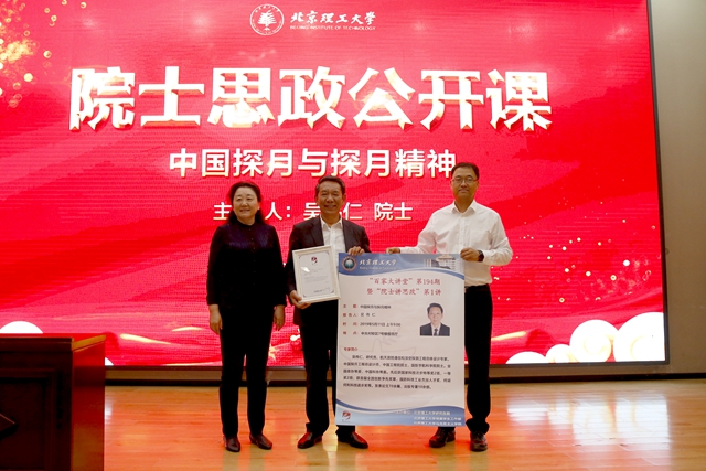 課上,吳偉仁院士與學生圍繞理想選擇、探月工程的未來發展等展開了熱烈的互動討論。最后,馬克思主義學院院長李林英、黨總支書記劉存福向吳偉仁院士頒發了北理工“百家大講堂”證書,并贈送了海報。活動結束后,同學們紛紛上臺與吳偉仁院士合影留念,一致表示受益匪淺。