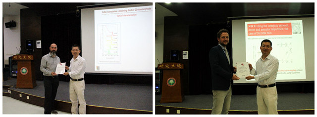 在國家外專局短期引智項目的支持下,受材料學院結構可控先進功能材料與綠色應用北京重點實驗室主任張加濤教授、李紅博教授邀請,國際半導體納米晶/量子點研究專家米蘭比科卡大學Sergio Brovelli教授和比利時根特大學Iwan Moreels 教授于9月22日至28日訪問北理工。9月26日上午,在中關村校區研究生樓101報告廳分別作了題為“Colloidal synthesis of fluorescent 2D nanocrystals across the visible and near-infrared range”和“Advances in electronic doping of solution-grown semiconductor nanocrystals towards cutting-edge application”的“百家大講堂”學術報告。張加濤教授代表北理工向兩位教授頒發了北理工“百家大講堂”紀念證書。材料學院鐘海政教授、陳棋教授,上海交通大學李良教授,澳大利亞科庭大學夾國華教授,以及材料學院、化學學院其他青年教師和學生聆聽了此次報告。