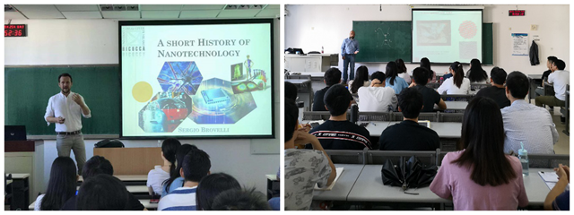 為了推進材化系研究生、本科生的全英文教學,在來訪期間,Sergio教授和Iwan教授根據學生的知識背景,結合自身教學、科研經歷,為材化系的研究生和本科生分別于24號和25號分別上了一堂全英文課程。分別講了納米材料與技術的發展歷史和半導體量子點的光電性質。他們通過圖片、視頻等方式進行教學,為同學們展示了納米材料的獨特魅力和科技前沿,在場師生收獲頗豐。課后,兩位教授耐心解答同學們的問題,并鼓勵他們保持科研熱情,積極申請國際交流。