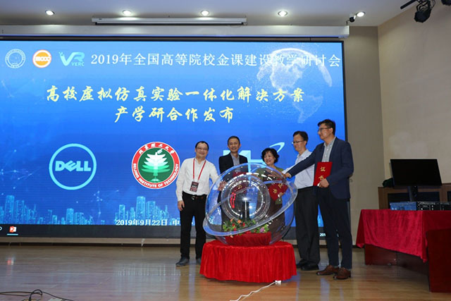 此外,本次會議的共同協辦方戴爾科技集團和北京理工科惠科技發展有限公司,聯合發布了“高校虛擬仿真一體化解決方案”,戴爾科技全球副總裁林浩先生與北京理工科惠總經理張曉煒先生作為雙方企業代表,與北京理工大學國家級虛擬仿真中心代表李鳳霞教授一并,接受了CMOOC聯盟聯席會秘書長張龍先生頒發的《一體化解決方案產學研合作協議書》,三方協作傾力打造的“一體化解決方案”,不僅可助力高校虛擬仿真中心建設,支撐各學科金課申報與教學改革,還為虛擬仿真實驗生態建設和智慧教育深度發展提供了切實可行的一體化解決方案。啟動儀式上,首批“一體化解決方案”用戶單位代表深圳大學教務部主任袁磊教授代表高校用戶做了主題發言。戴爾全球副總裁和理工科惠總經理張曉煒分別做了主題演講。