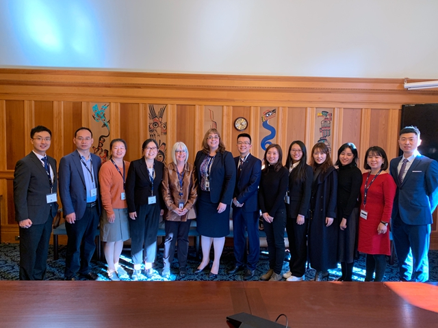 步入不列顛哥倫比亞省議會大廈,帥氣專業的解說員用其夸張而有趣的腔調為我們全面細致地介紹了議會大廈的歷史及加拿大的政治體制。之后議會議員和人力資源廳常務副廳長友好的接見了訪學團。加拿大是多黨執政國家,每屆4年,為更好地獲得民眾支持,議會政府會不遺余力為民眾創造獲得感,比如為各行各業制定完善的培訓體系,讓每個人都能獲得專業培訓、就業的機會等。