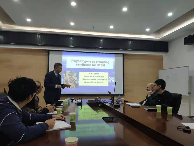 Vladimir E.Zarko教授在報告中介紹了納米含能材料和聚氮化合物的發展歷史,分析了各個國家的研究者對納米含能材料和聚氮化合物發展所作出的貢獻,探討了含能材料未來的發展方向。Vladimir E.Zarko教授的報告圖文并茂,深入淺出,給在場師生帶來了一場頂級的學術盛宴。報告結束后,Vladi mir E.Zarko教授與在座的師生們就含能材料的發展問題進行了熱烈討論。