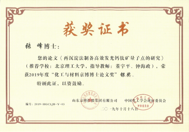10月17日至20日,2019中國化工學會年會在濱海城市山東青島召開。在此會議上,2019年度化工與材料京博博士論文獎舉行了頒獎儀式,材料學院2018屆博士畢業生張峰斬獲銀獎,為北京理工大學材料學院在學會優博的榮譽榜上增添了亮麗的一筆。本次所獲銀獎的博士論文題目是“再沉淀法制備高效發光鈣鈦礦量子點的研究”,指導教師是董宇平教授和鐘海政教授。
