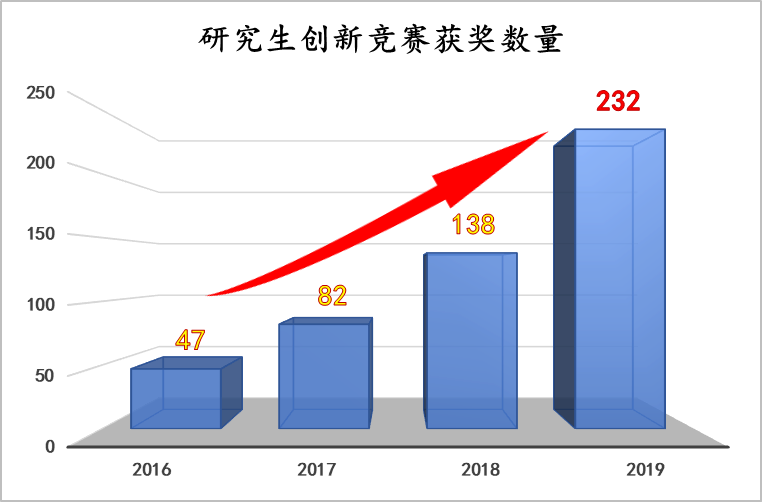 2019年,我校研究生參與各類科技創新活動并獲省部級以上科技創新競賽獎232項,創歷史新高。全年研究生參與科技創新競賽活動超過3000人次,一年級研究生參與科技創新的人數占比超過40%。