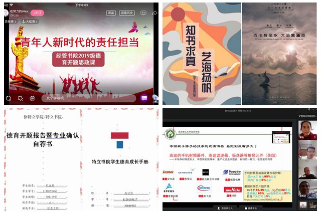 各書院堅持以習近平新時代中國特色社會主義思想為指導,以立德樹人為根本,以理想信念教育為核心,以學生疫情防控期間所聞、所見、所思、所想為切入點,通過學生交流分享、教師點評指導、布置德育作業等多種手段開展各具特色的系列活動,教育引導學生以“大我”定位“小我”,以國家需要指引人生航向,切實激發求學報國的內生動力。精工書院通過與專業宣傳月相結合等多種形式,鼓勵學生探索自我價值、社會屬性,結合愛國情懷和社會需要樹立人生理想;睿信書院鼓勵學生思考當下,暢想未來,確立人生坐標,撰寫自己的未來“劇本”,做大學生活的導演;求是書院將北理工八十年的校史校情融入到求是書生的德育開題工作中,以史為鑒,助力學生成長成才;明德書院圍繞“立德”二字,結合書院“禮、樂、射、御、書、數”的“六藝”培養體系,引導學生樹立目標、認識自我、思考人生;經管書院通過開展“云端致遠大講堂”“云端經管有約”“云端辯論賽”“十年后的我”“云端共克時艱、歷練成長”主題分享會等活動,啟發和激勵學生深入認識自我、探索未來發展方向;知藝書院通過接力添畫的方式凝心聚力,結合自身思考,在線上共同完成一幅幅帶有班級特色的畫作;特立書院組織學生制定個人德育成長檔案和班級海報,并以視頻的方式記錄下每位同學對自己大學四年的成長寄語;北京書院從責任擔當、專業前景、能力訓練、學習風氣、學期總結及未來規劃以及疫情期間感受等六方面引導同學們認真規劃大學生活及未來發展。