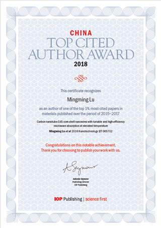 日前,材料學院曹茂盛教授收到英國皇家物理學會(IOP)發來的賀信,其指導的博士生盧明明和王希晰以共同第一作者身份發表在Nano...