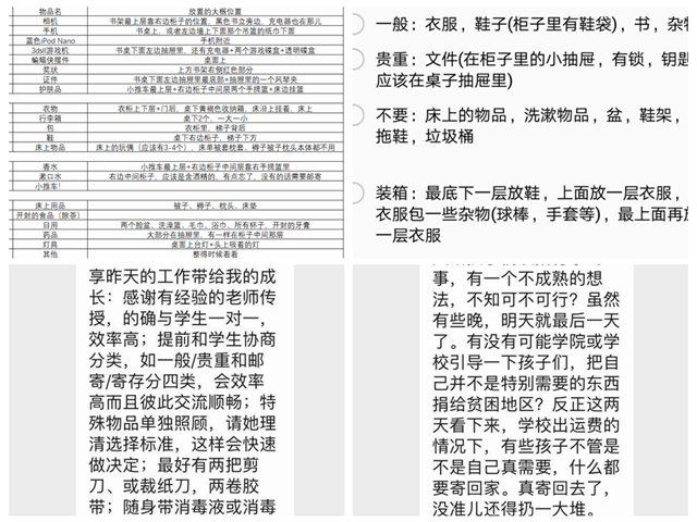 根據(jù)工作實(shí)際,志愿者們及時(shí)總結(jié)并交流經(jīng)驗(yàn)。部分老師建議提前與學(xué)生進(jìn)行一對(duì)一溝通,以便提高工作效率;部分老師號(hào)召同學(xué)們將不用的物品捐給有需要的人,將愛(ài)心傳遞下去。