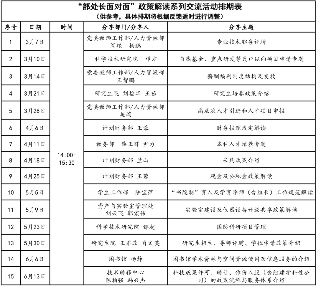 延伸了解:“部處長面對面”政策解讀交流系列活動是由教師發展中心組織,學校管理部門參與、面向全校教職工開展的座談交流活動。系列交流活動將從3月持續到6月,活動將邀請黨委教師工作部/人力資源部、學生工作部、教務部、研究生院、計劃財務部、科學技術研究院、資產與實驗室管理處、圖書館、技術轉移中心等部門,對相關政策制度進行解讀,并與教職工進行具體溝通交流。