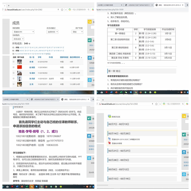 2月4日,學校發布了《關于推遲2020年春季學期開學時間的通知》,學院積極響應,根據學校疫情防控教學專項會議精神,成立以院長書記為組長、教學院長和學生工作副書記為副組長的“化學與化工學院教學質量保障組”,負責落實本學期的教學方案和教學過程的實施情況,確保疫情防控期間本科教學的順利進行與高質量教學效果。建立了學院樂學微信群,及時討論、學習樂學平臺線上課程的準備以及解決相應的問題,并在群里發布問卷星調查表,隨時掌握課程進度和問題;目前,學院除9門需要在實體實驗室進行的實踐類課程外,全部理論課程(共計29門)已經按照教學計劃在樂學平臺上建課,主講教師應用多種信息化資源,錄制帶音頻的PPT、使用MOOC、SPOC等網上優質教學資源,以多種教學模式結合來準備網絡授課;同時,在樂學平臺基礎上,各課程還建立課程微信群、慕課堂等,特別加強與學生互動,督促調動學生學習主動性。《給化學與化工學院學生的一封信》在開課前推送給所有學生,提醒學生主動參與網絡教學,齊心協力,完成現階段遠程教與學。