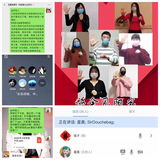 學院迅速占領網絡思政教育高地,動員和組織開展“眾志成城、共克時艱,大學生在行動”網絡主題教育活動,以及“眾志成城、中國加油”線上團日活動,創新形式、寓教于樂,通過線上學習、討論、講述、實踐、展示等方式,鼓勵學生抗擊疫情的信心決心,引導學生以實際行動弘揚正能量,為打贏疫情防控阻擊戰做出應有貢獻。