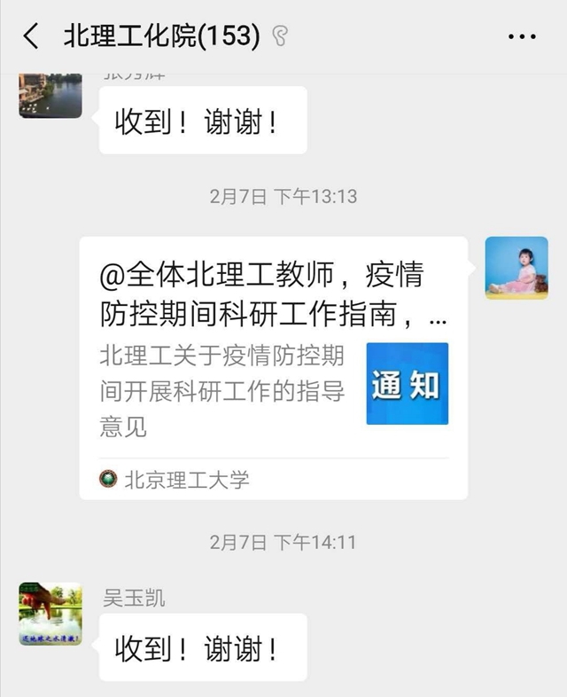 編輯:秦月 審核:王振華 張加濤 閱讀次數:疫情防控期間,北理工化學與化工學院按照學校黨委關于做好新型冠狀病毒感染的肺炎疫情防控工作的相關要求,第一時間成立了以學院黨委書記、院長為組長的疫情防控工作領導小組,全面落實黨中央及各級部門決策部署,完善本學院防控舉措。小組成員分工負責,強化責任擔當,及時在防控工作群傳達學校最新疫情防控要求,并按照學校要求在做好疫情防控工作的同時,扎實有效地推進了學院科研、教學、學生管理等各項工作。