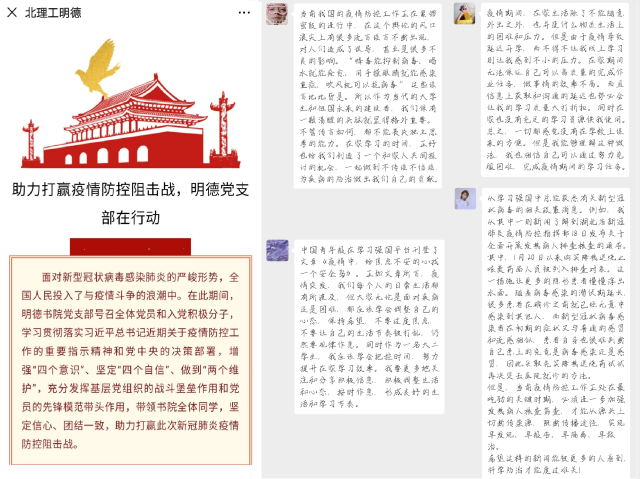 “作為學生黨員,我們要時刻牢記使命,樹立起服務同學、聯系同學、號召同學的意識。”明德書院學生黨員,積極響應,以網絡社交平臺為陣地,充分發揮先鋒模范帶頭作用,助力打贏此次新冠肺炎疫情防控阻擊戰。