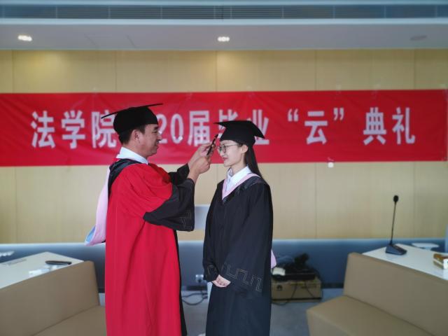 法學院唯一的一位2020屆在校的畢業生王瑞瑞同學在現場接受院長李壽平教授的撥穗正冠。