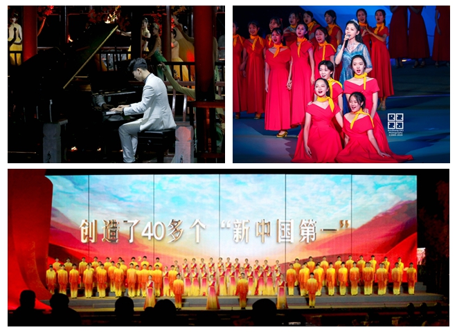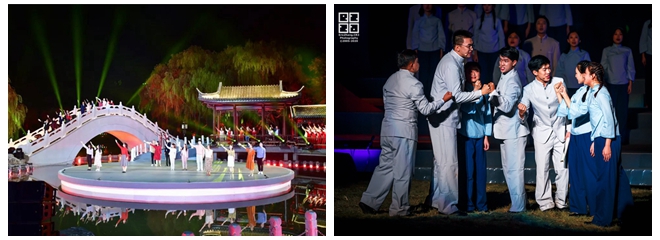 伴隨著柔和的燈光、動情的旋律,序幕“延安根”開啟。一曲《我愛你中國》唱出了同學們的赤子心聲,水榭里、石橋上、舞臺中,來自學校各個學院的師生們用飽含深情的話語為母校獻上由衷的祝福。情景故事《夢回延安》將觀眾帶到80年前的延安,上百名演員通過講述、歌唱和形體表演等形式再現自然科學院創建及校址遷移時期的場景。