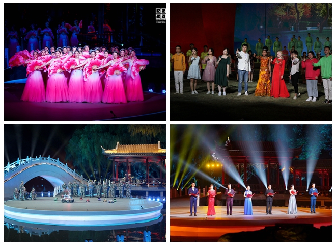 在絢爛多彩的屏幕緩緩降下時,尾聲“創未來”從遠處棧橋上北理工交響樂團的演奏中徐徐展開,環北湖燈光亮起,各學院、書院代表英姿颯爽手舉院旗向觀眾席走來,八面北京理工大學校旗在眾人簇擁下,飄揚在絢麗的舞臺上。北湖畔的樹林中、山坡上、拱橋邊、廊亭下,數千名北理工師生佇立其間共唱校歌,將晚會推向高潮。在全體演職人員嘹亮的《歌唱祖國》聲中,晚會圓滿結束。