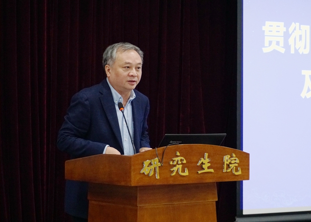 會議邀請了教育部“雙一流”建設重大攻關項目首席專家、中國學位與研究生教育學會副會長、北京理工大學研究生教育研究中心主任王戰軍教授作輔導報告。報告從多個角度展開,回顧了新中國研究生教育70年的發展歷程、成就和經驗,分析了進入新時代研究生教育的重要地位,深入解讀了全國研究生教育會議和相關文件精神。報告講到,研究生教育肩負著高層次人才培養和創新創造的重要使命,是國家發展、社會進步的重要基石,是全球人才競爭的戰略資源。全面貫徹全國研究生教育會議精神,落實教育部、國家發改委、財政部發布的《關于加快新時代研究生教育改革發展的意見》,開展研究生教育改革專項行動,解決存在的突出問題等,是從事研究生教育管理人員今后的重點工作。大家要不斷提升思想認識,深入理解會議和文件精神,結合具體工作進行深入思考,統籌謀劃,抓好落實,走研究生教育發展強校之路。
