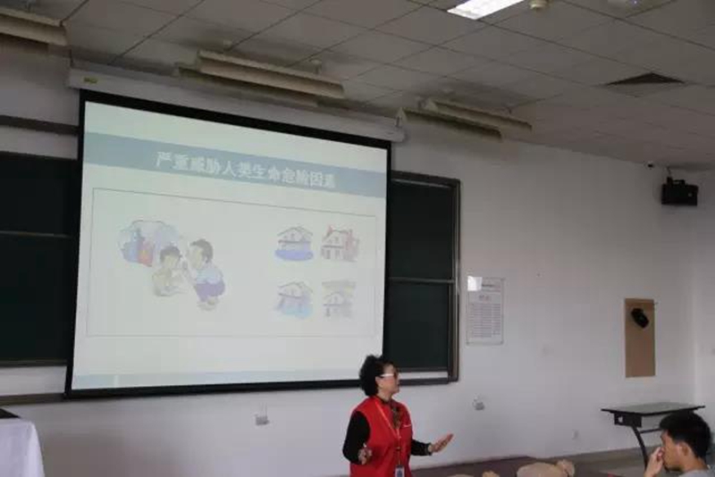 接下來,嬴老師為志愿者們講解了心腦血管疾病的突發應急處理措施。嬴老師說:“無論在年輕人中還是老年人中,最危險的導致死亡的病情是猝死。而猝死的直接原因是心搏驟停,其特征是無心跳無意識無脈搏。當人發生猝死時,最最黃金的時間只有4分鐘,我們作為志愿者,當遇到這樣的情況,我們一定要勇敢地上前施救,為病人延續生命。在講解的過程中,嬴老師還為志愿者們播放了短片,通過實例來加深志愿者們的印象。”