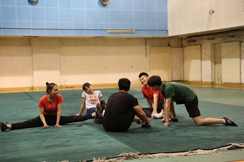 武術(shù)隊(duì)每天的訓(xùn)練都從鋪地毯開始,重以噸計(jì)的地毯需要大家一起用力才能完全鋪開。鋪好地毯,大家就開始自發(fā)地進(jìn)行熱身準(zhǔn)備活動(dòng)。“這些孩子都是從小就學(xué)武術(shù),每天都要練基本功。”張老師在關(guān)注同學(xué)們做動(dòng)作的同時(shí)也會(huì)時(shí)不時(shí)地進(jìn)行動(dòng)作指導(dǎo),“腿快一點(diǎn)”、“重心放低”、“這個(gè)動(dòng)作要定住” ……隊(duì)員們也都認(rèn)真地進(jìn)行著動(dòng)作的改進(jìn)。