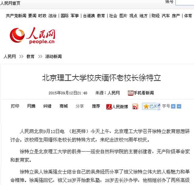 人民網(wǎng)北京9月12日電(趙英梓)今天上午,北京理工大學召開徐特立教育思想研討會。該校師生用緬懷老校長的特殊方式,來紀念該校75周年校慶。