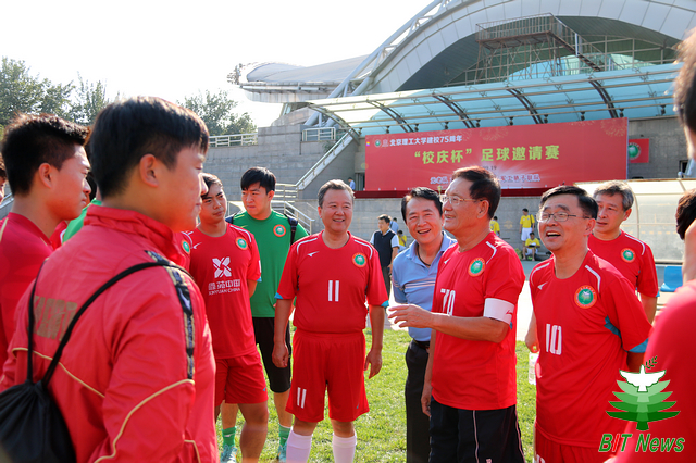 9月19日下午,在北京理工大學喜迎校慶75周年的日子里,首屆“校慶杯”足球邀請賽在東操場舉行。參賽的一方由北京理工大學老校友元老隊加上北理工學生足球隊的部分隊員組成,另一方是由北京理工大學首屆“軍工杯”足球邀請賽的九支參賽隊中精英組成的軍工驕子聯隊。北京理工大學校長胡海巖院士,原北京市副市長、老校友范伯元教授,北理工足球隊總顧問金志揚教授,北京理工大學副書記副校長項昌樂教授等參加了比賽揭幕儀式并與雙方隊員合影留念。
