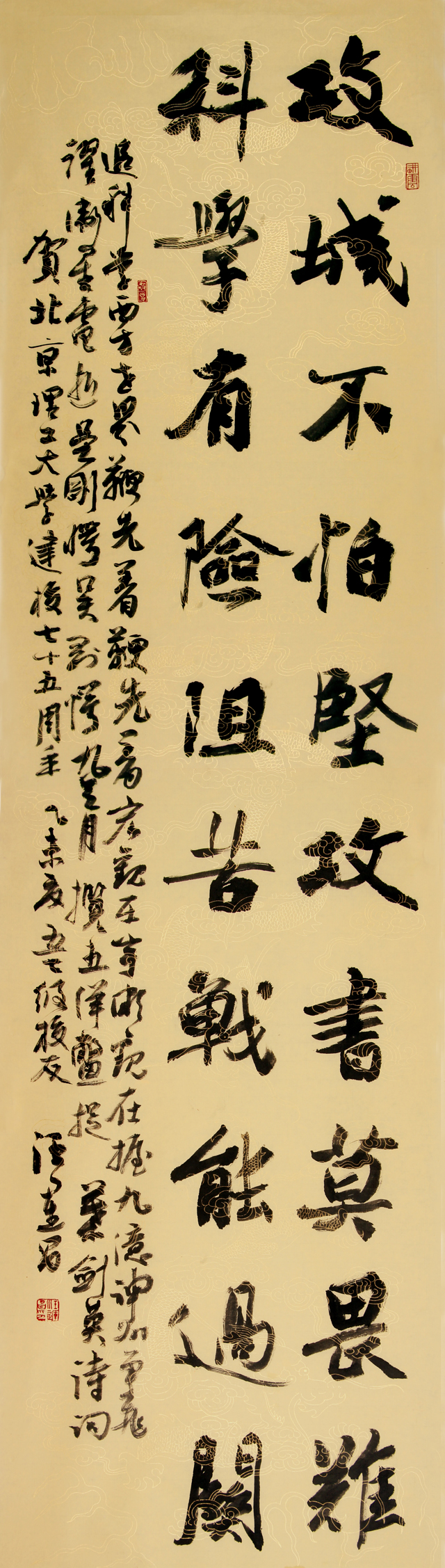 汪運昌先生,號賞古齋,中國書法家協會會員,1962年從北京理工大學畢業后,從事軍事科研工作,同時酷愛書法藝術。回憶起大學時代,汪老先生感嘆道,那時候條件艱苦,從河北的一個普通農村家庭考到北京理工大學,是當地新中國第一代大學生,完全靠著國家提供的助學金,讀完五年大學,沒有再向家里要過錢。汪老先生在校學習勤奮,善于動腦,學習成績非常優秀。講述業余時間文藝活動時,汪老先生臉上揚起了燦爛的笑容,當時他參加了學校的民樂隊,當時北理工民樂隊表演水平非常高,在北京高校中數一數二。他興奮而又謙遜地說他在里面也就是“濫竽充數”。正是在母校豐富的業余文藝氛圍熏陶下,汪老先生的藝術素養得到提升,也為以后從事書法藝術創作奠定基礎。