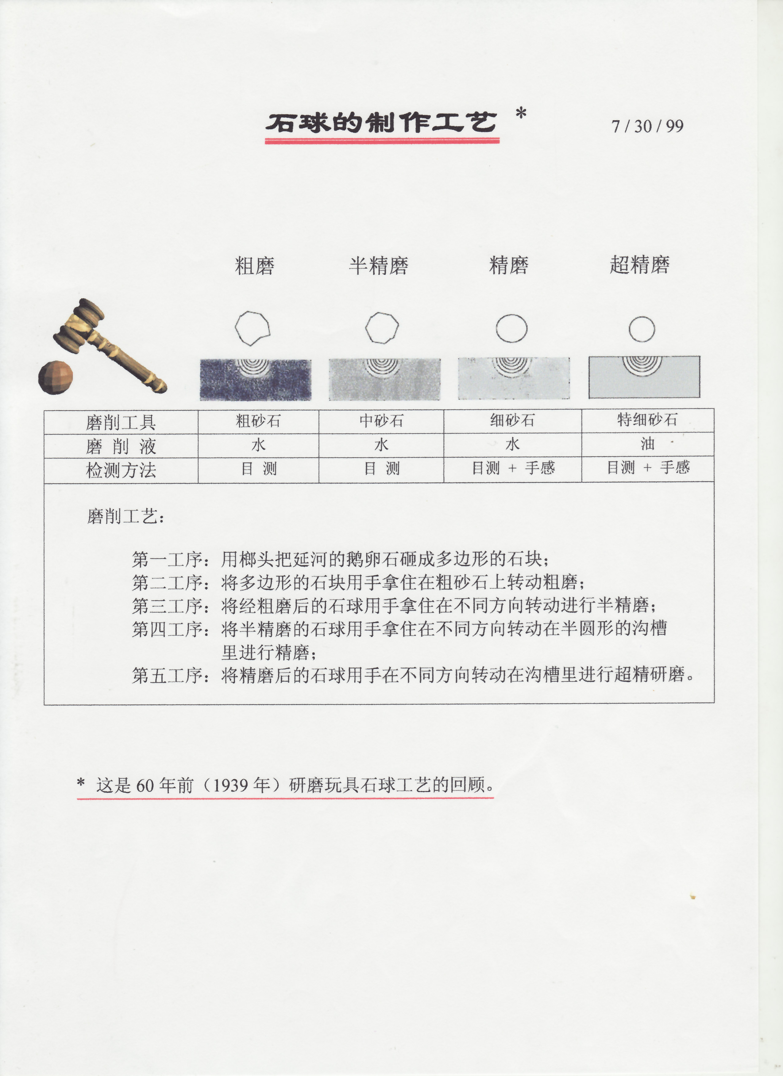 物質的匱乏并沒有影響兒童愛玩的天性,反而激發了他們動手發明玩具的想法。手巧的曾老自制過手磨“石珠”,其圓潤程度相當于如今的玻璃球,就是用延河邊撿來的石子磨成圓圓的珠子用來練習拇指的彈力,也正是這種“石珠”陪曾老度過了漫長學習之余的農閑時光。這些“石珠”曾老一直保留至今,有一個外國友人用現代精密測試設備測量這些石球的真球度和表面精度,結論為真球度0.2毫米,表面精度為3微米的高精度。友人大為吃驚,用手磨又沒有檢測工具,不可想象。后來這位友人讓曾老把制作“石珠”的工藝手法和工具寫下來給他,他才理解了曾老的“手藝”。